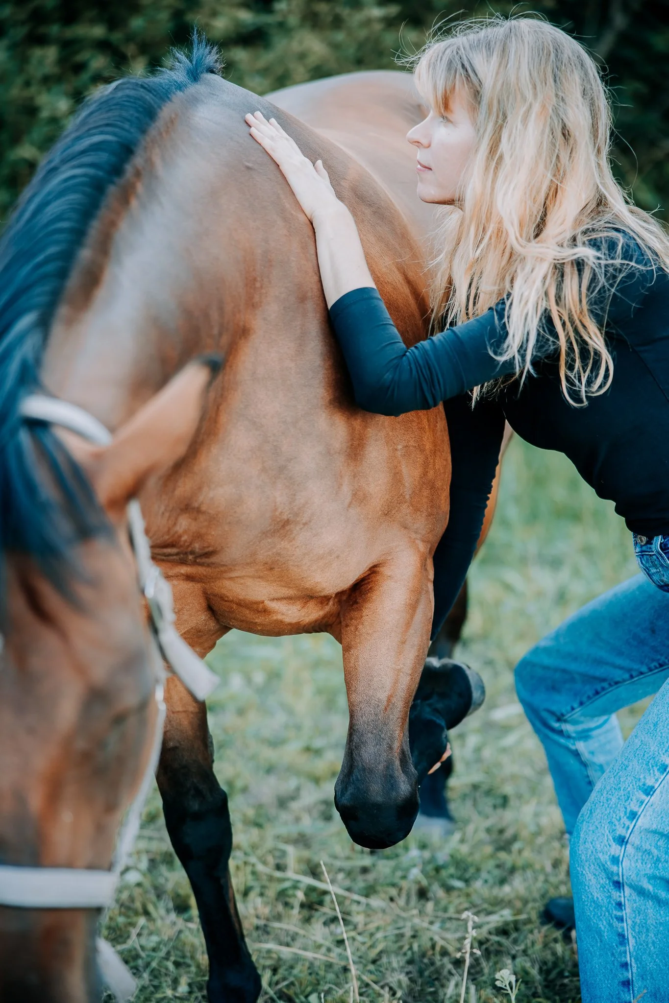 Ergänzend kommen physiotherapeutische Maßnahmen wie Massage- und Dehntechniken sowie Kinesiotaping zum Einsatz, individuell angepasst an die Bedürfnisse des Pferdes.